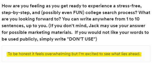 If they approached me today, I would’ve first referred them to our free College Confidence Community, a community dedicated to helping families connect and ask questions about the process. Included in the community are several videos from various sections of our actual College Confidence Roadmap. Make sure to check them out.