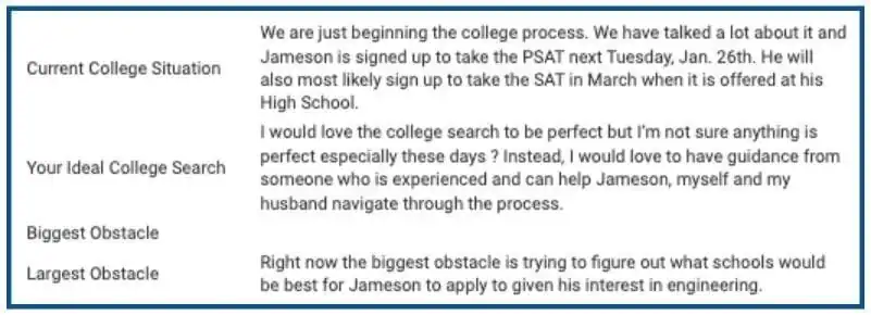 As you can see, Jameson was “just beginning the college process” as a high school junior. He didn’t have a school list yet, and didn’t quite know where to start.