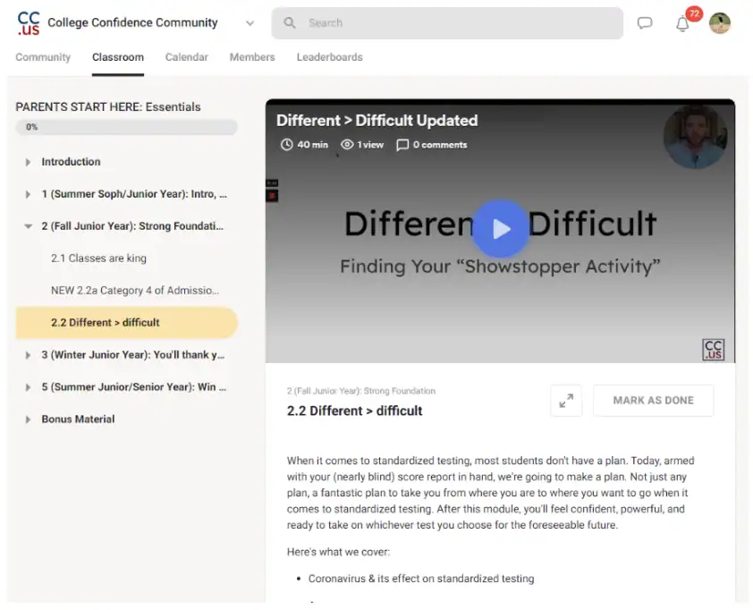 If you want to learn more about the 4th category of admissions, including the Showstopper Activity, and how to become a focused student, join the free College Confidence Community dedicated to helping families navigate the entire process. Once you’re there, watch the videos “2.2a Your Story” and “2.2b Different > Difficult” for more information on how to stand out (pictured below).