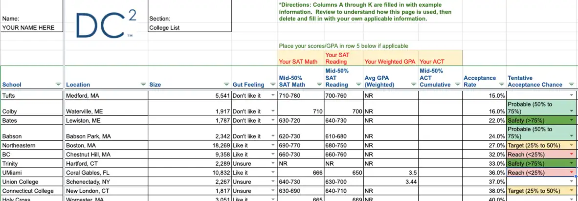 Across the top, put the following titles: School Name, Location, Size, Gut Feeling, Mid-50% SAT, Mid-50% ACT, Avg GPA, Acceptance Rate, Student Notes, Parent Notes, Tentative Acceptance Chance
