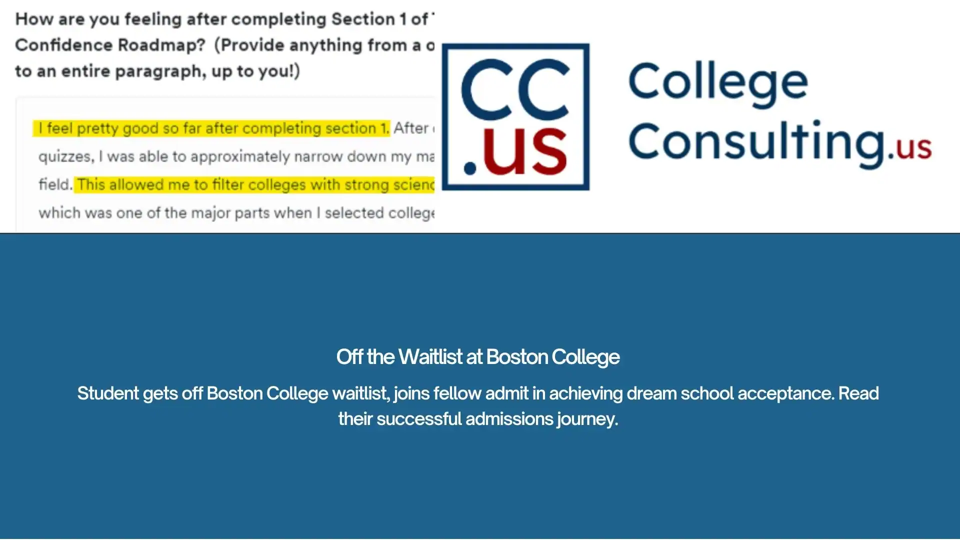 Towards the end of that blog, I referenced even more great news… we had ANOTHER student get off the BC waitlist as well. That student’s name is Ethan. Like what I did for Behram, I think it would be beneficial for you to see Ethan’s complete story and how he leveraged our program to get into one of his dream schools. To tell that story, I’ll use what Ethan had to say after completing each section of our roadmap.
