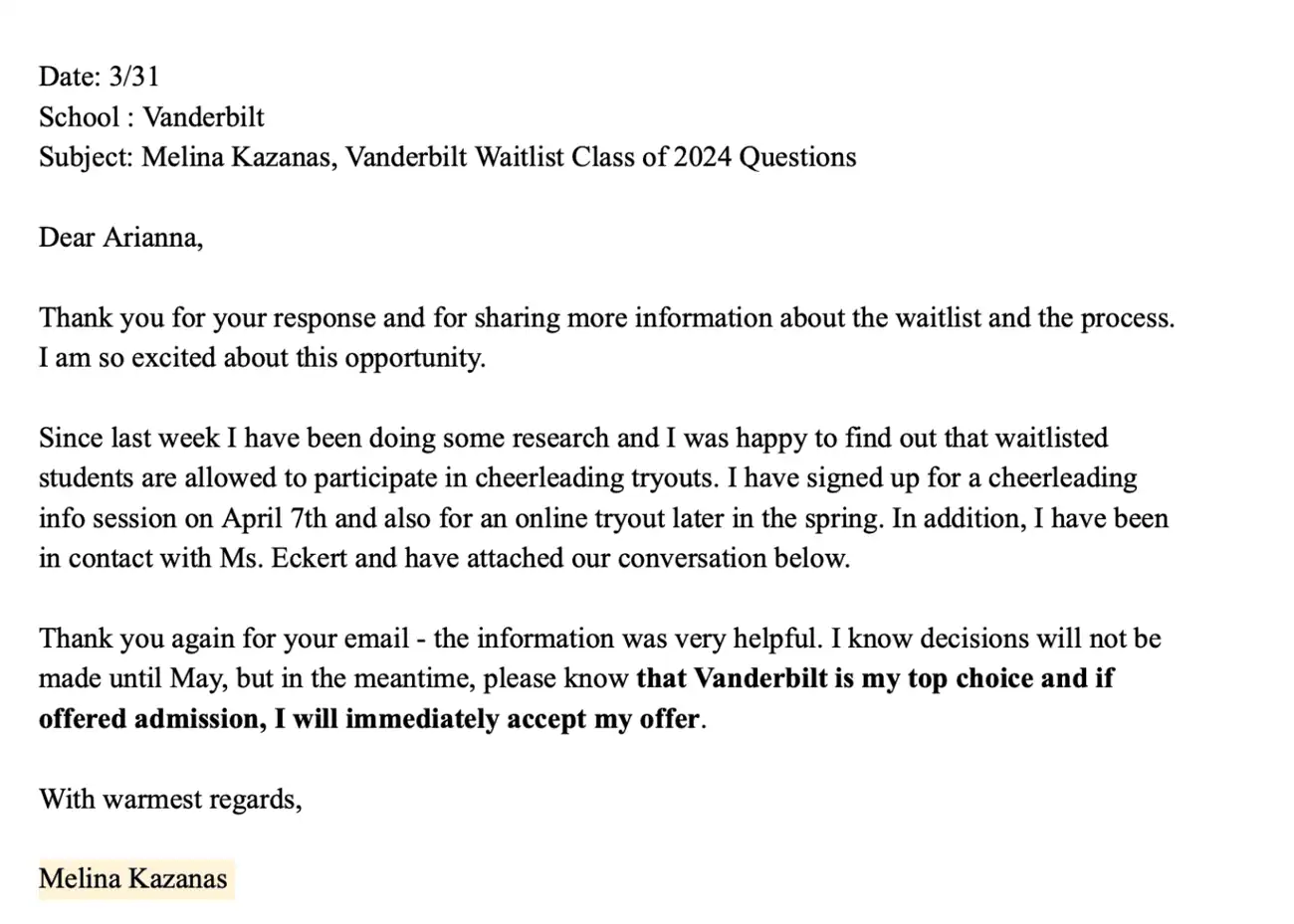I wrote a LOCI that dug deep. I shared new academic awards and connected my interests to Vanderbilt’s campus culture and academic opportunities. I ended the letter with a simple but clear statement: if admitted, I would enroll.