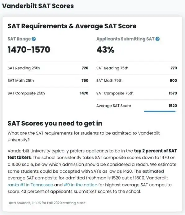 If your test score falls below the 25th percentile, I recommend NOT reporting your score. Doing so will likely hurt your application (In the Vanderbilt example above, that would be an SAT composite below a 1470)