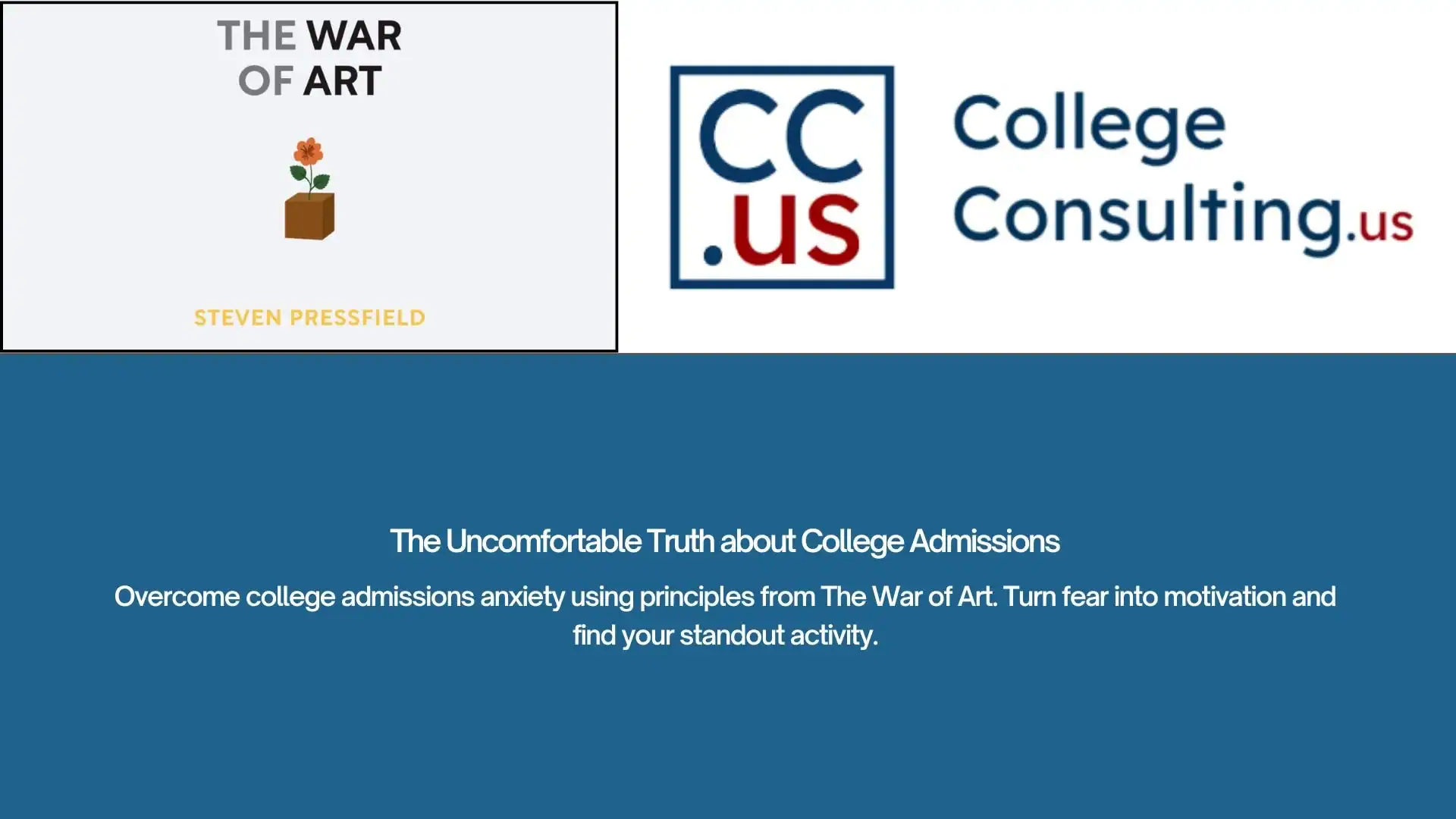 In The War of Art, Pressfield details the internal battle with “resistance” that everyone faces as they begin a project. Although mainly discussing projects like building a new habit, starting a book, or founding a company, his ideas apply to college admissions.