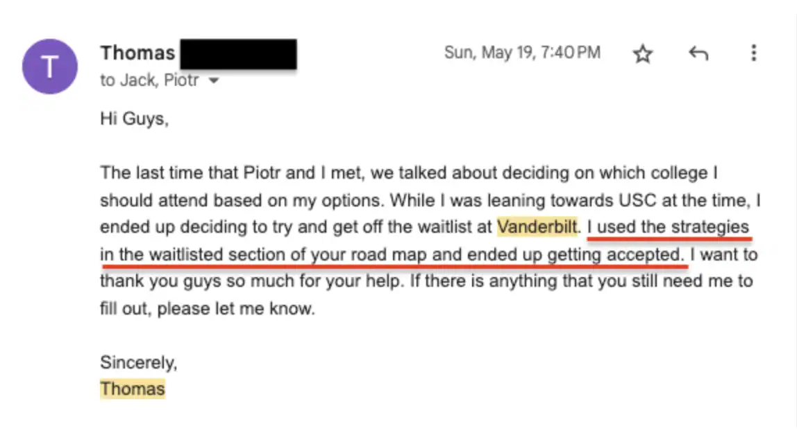 I think my favorite part of the curriculum was the ability to schedule private meetings with Jack and Piotr whenever I wanted to get advice on anything including essay writing, college application lists, and strategy. I’d recommend the program because it was a pretty comprehensive guide to everything related to college applications. The road map covered topics such as how to strengthen your profile as an applicant, deciding on your college list, and essay writing. And if for some reason you felt the road map didn’t answer one of your questions, you could easily schedule a meeting to speak with Jack or Piotr. I think I must’ve scheduled around two dozen meetings with Piotr for my essay writing. Lastly, I believe that had I not known the program’s advice for getting off the waitlist, I may have never gotten into my college of choice.”