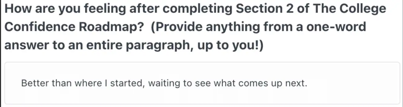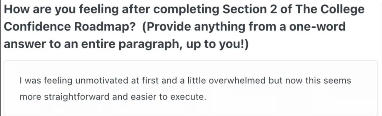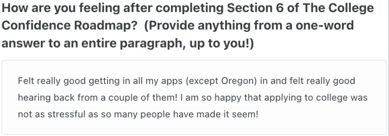 Sometimes, success is measured in small victories. Even incremental progress can bring a sense of optimism and anticipation. For this student, completing one section of the roadmap created momentum, setting the stage for continued growth. This feeling of “waiting to see what comes next” reflects a shift in mindset, from apprehension to curiosity. It’s a reminder that the admissions process isn’t just about the destination but also about personal growth along the way.